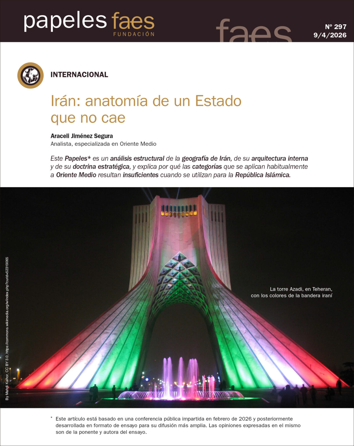 Este Papeles es un análisis estructural de la geografía de Irán, de su arquitectura interna y de su doctrina estratégica, y explica por qué las categorías que se aplican habitualmente a Oriente Medio resultan insuficientes cuando se utilizan para la República Islámica.